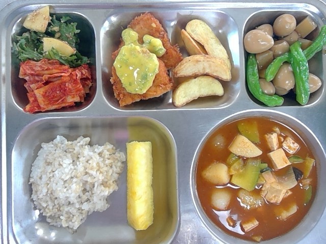 발아현미밥/한우고추장찌개/메추리알곤약장조림/사과치커리무침/치킨까스&감자튀김&소스/파인애플조각