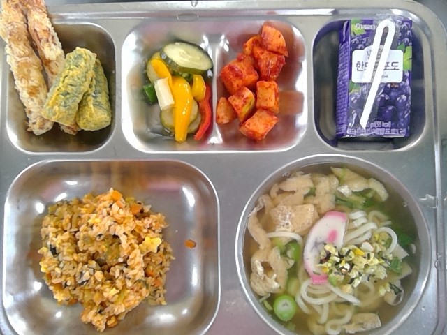 김치볶음밥&유기농김자반/우동장국/새우&김말이튀김/깍두기/모듬채소피클/포도주스