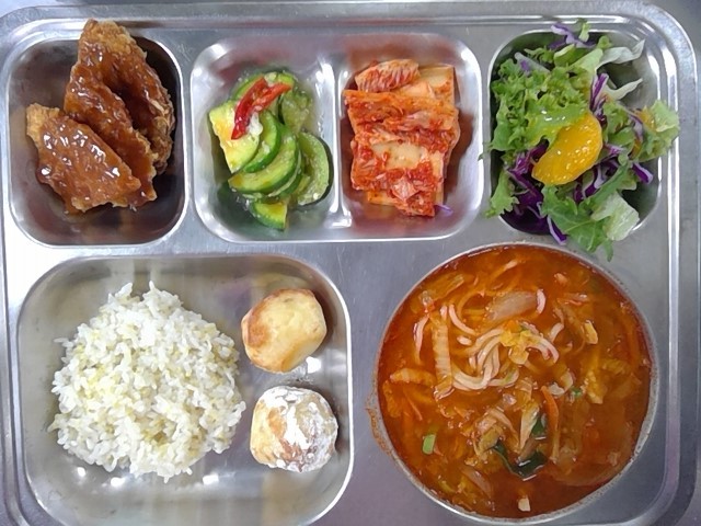 기장밥/짬뽕국/만다린샐러드/애호박새우젓볶음/등심돈가스/알감자버터구이/배추김치
