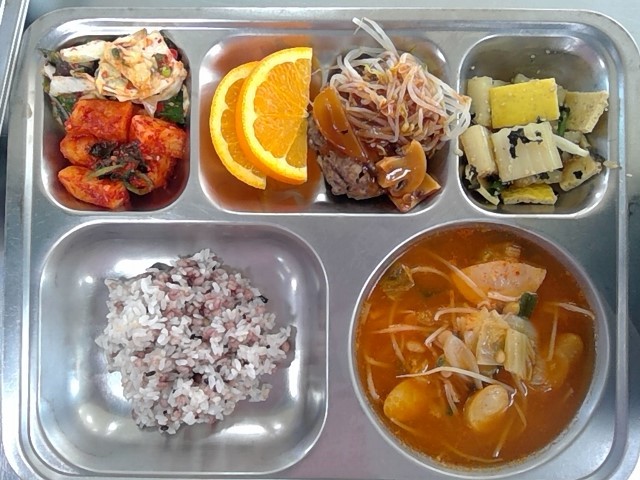 혼합잡곡밥/부대찌개/양배추무침/청포묵김가루무침/그릴함박&숙주나물/총각김치/오렌지