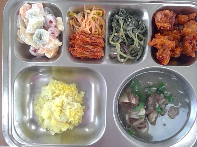 강황쌀밥/한우갈비탕/과일샐러드/냉이된장무침/매운콩나물무침/닭순살강정/배추김치