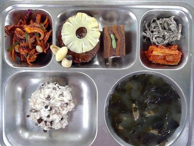 팥밥/한우미역국/주꾸미야채초무침/고사리들깨볶음/파인애플&떡갈비&버섯구이/배추김치/케이크
