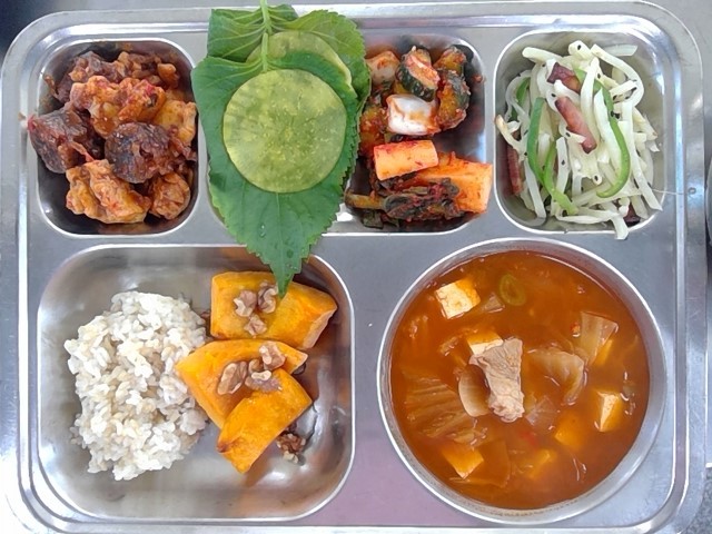 발아현미밥/돼지고기김치찌개/단호박꿀찜/도라지오이무침/감자채베이컨볶음/닭갈비순대볶음/총각김치/레몬무쌈&깻잎쌈